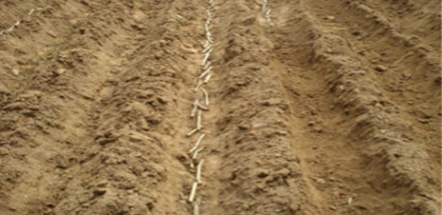 Trenches are dug at a distance of 75-90 cm, with the help of a ridger or by manual labour. The trenches should be about 30 cm deep. The mixture of fertilizers (NPK) should be spread uniformly in the trenches and mixed thoroughly in the soil. The sets are planted end to end in trenches. Drenching of setts with chlorpyriphos 20 EC (1 kg a.i./ha or 5 litres/ha) to protect from soil-borne insects is required. The trenches are filled up with loosened soil after planting.